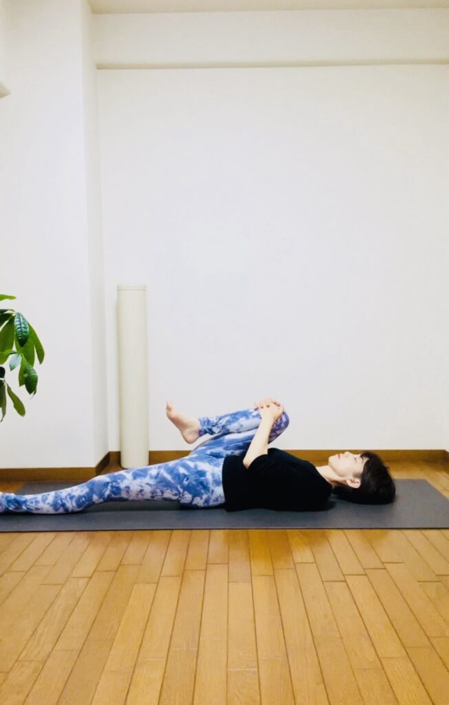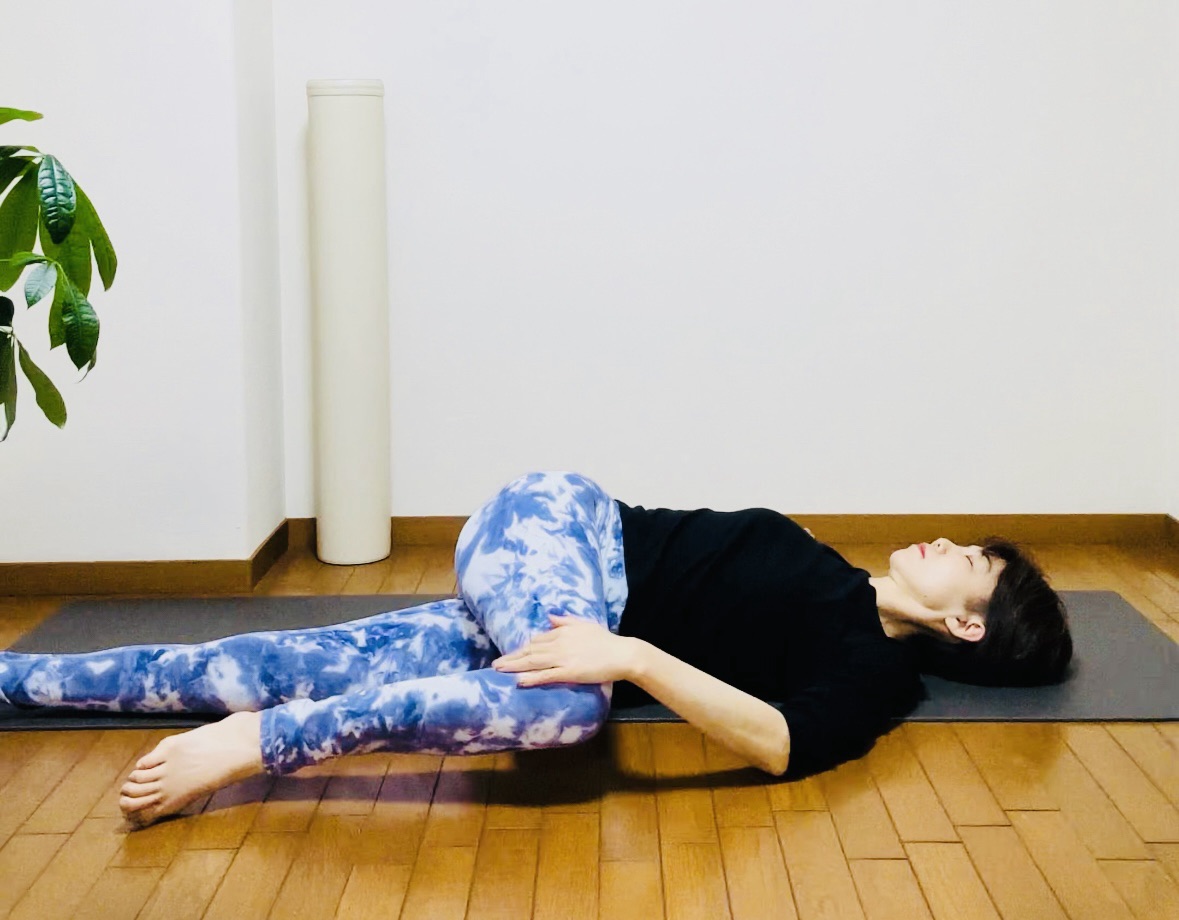 ガス抜きのポーズから右手を胸の横に広げ、右膝を左に倒す